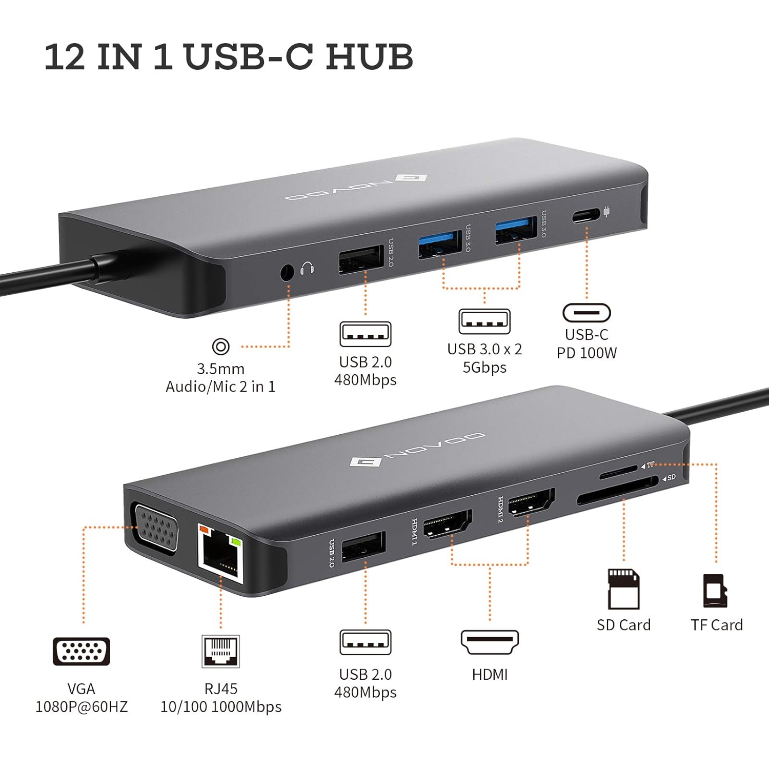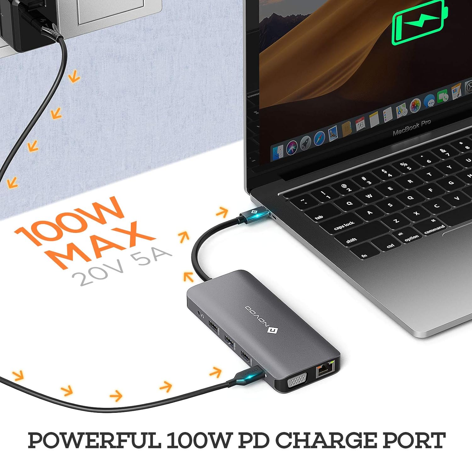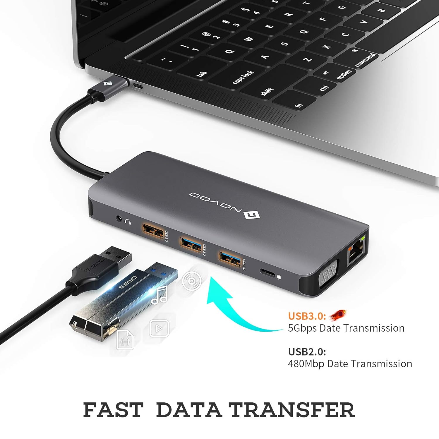 · 4K@30Hz HDMI Output 1080P@60Hz VGA Output Up to 5Gbps Data Transmission Speed Support BC 1.2 5V/1.5A USB Charging Support 10/100 /1000Mbps Ethernet Up to 20V/5A Power Delivery support Support CTIA Standard 3.5mm Stereo Audio/Mic function