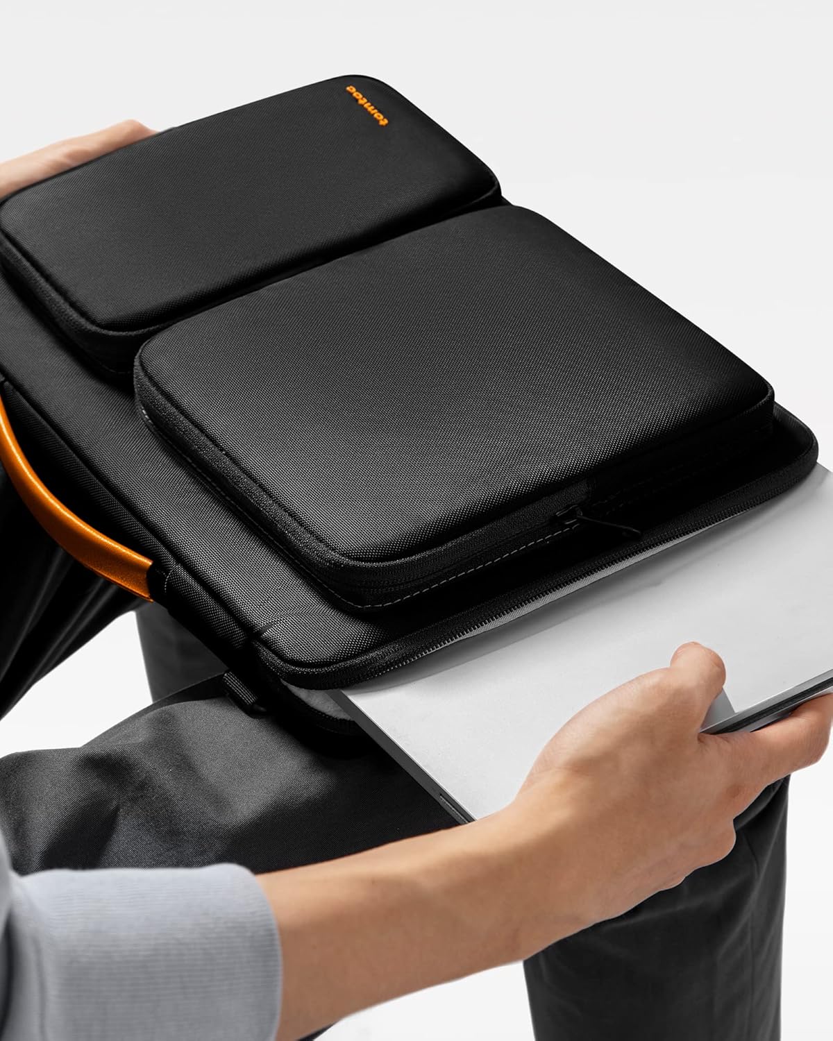 tomtoc's laptop shoulder bag features two front large zipper compartments for additional storage. With penholders, small card pocket, the bag makes it easier than ever to organize your digital accessories.